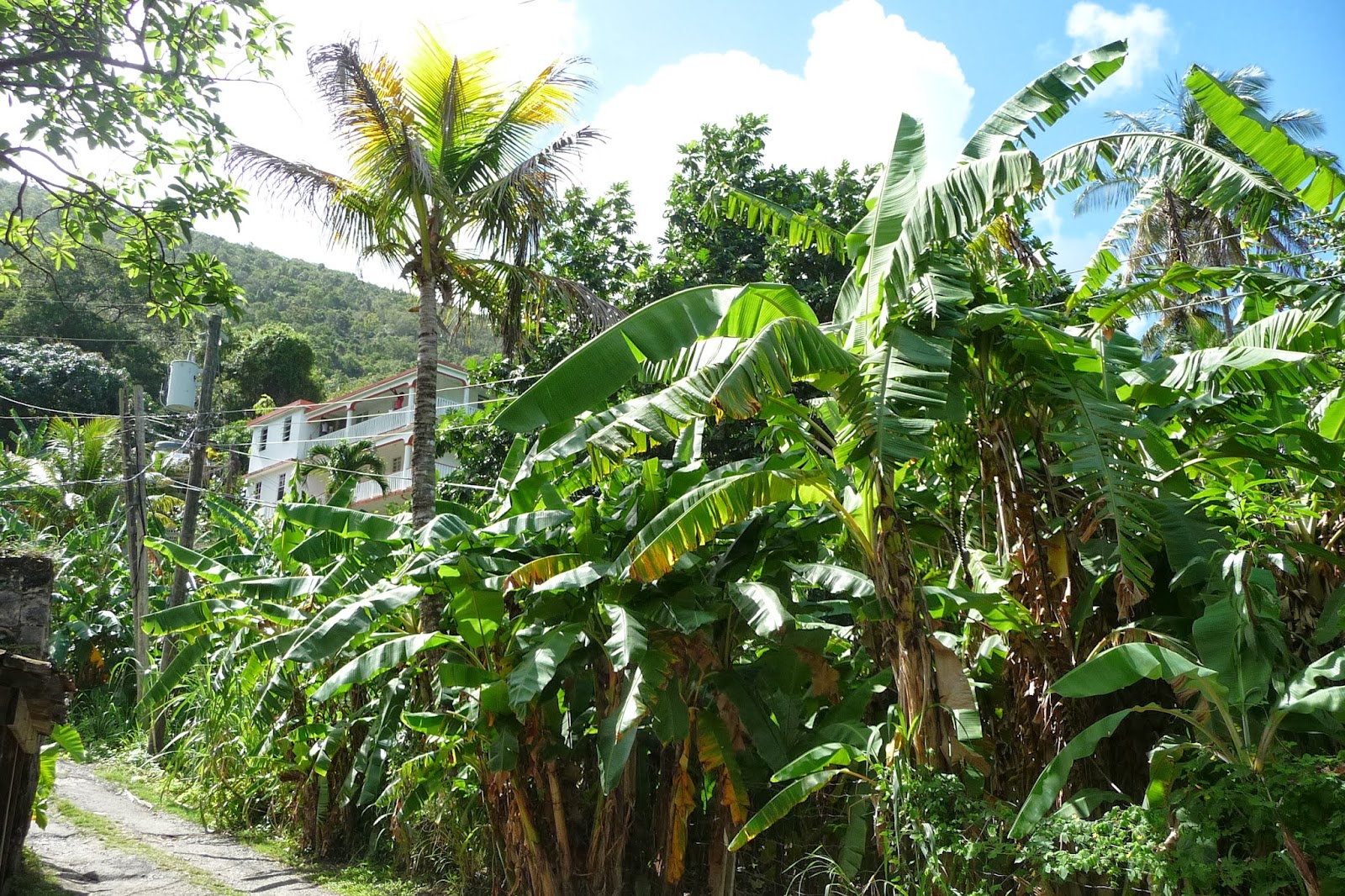 Banaanipuita tien varsilla. Pieni lisko on jäänyt myös kuvaan.