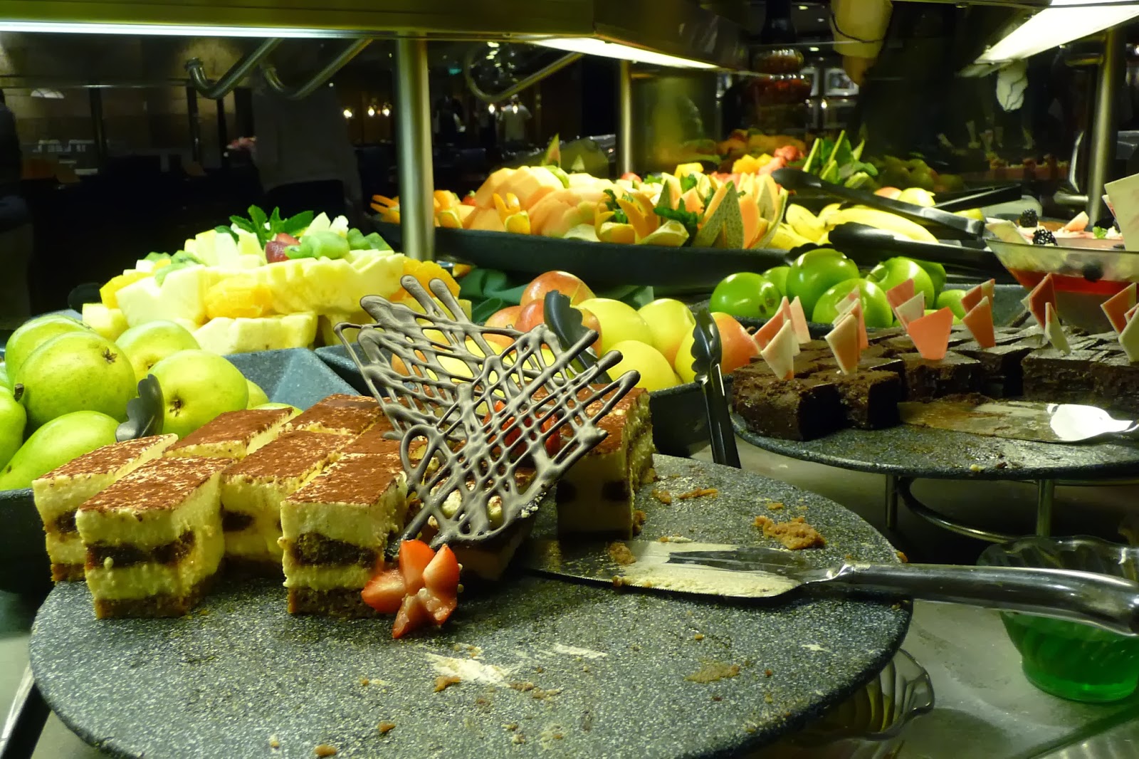 Seuraavaksi haluan kertoa ruokapaikoista ja ruuista yleensä. Hyvä ruoka on tietysti erittäin tärkeä osa risteilyä. Risteilyn hintaan kuuluvat siis melkein kaikkien ravintoloiden ruuat ja alkoholittomat juomat (vesi, lime- tai passiolimu, kahvi, tee ja kaakao). Mutta esimerkiksi cocis ja jaffa ovat maksulliset. Lisäksi laivalla on kaksi isämaksullista ravintolaa, mutta me emme niissä käyneet. Kattausmaksu Chops Grillessa on 30$/hlö ja Portofinossa 20 $/hlö.