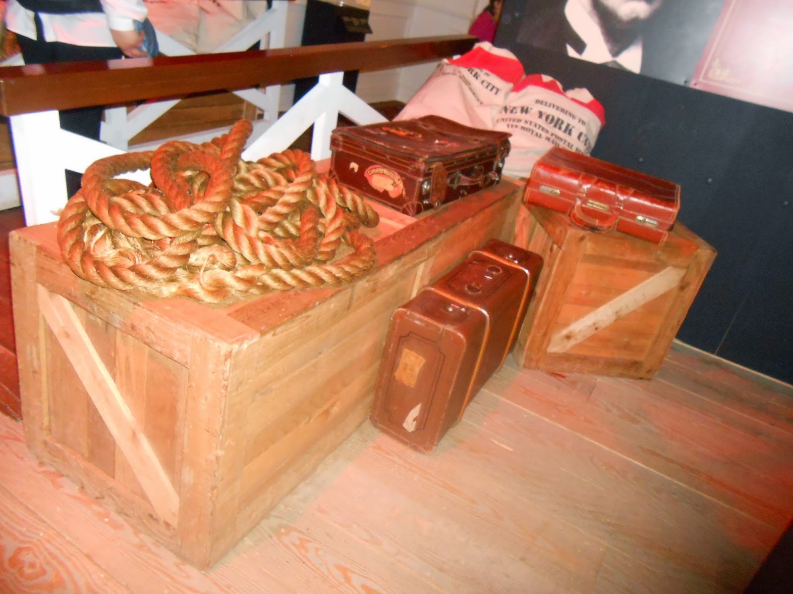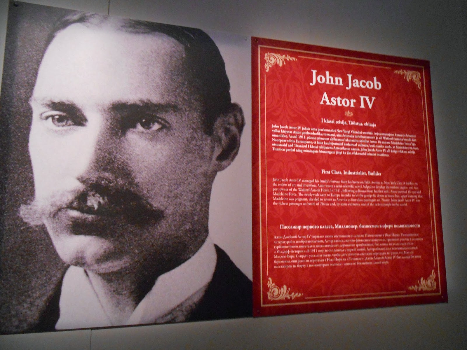 Tyttäreni sai sen ajan yhden maailman rikkaamman miehen (John Jacob Astor IV) vaimonsa (Madeline Astor) maihinnousukortin ja tietysti he matkustivat ykkösluokassa. John hukkui Titanicilla, mutta Madeline pelastui. Näyttelyssä oli John Jacob Astorin IV kuva ja tarina.