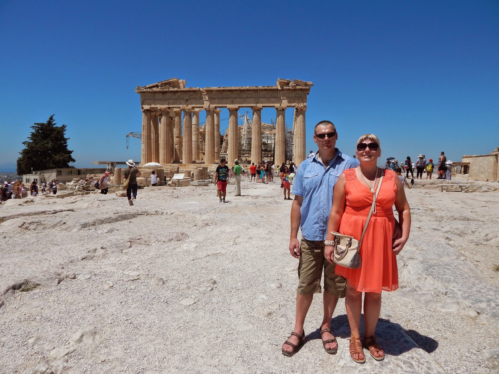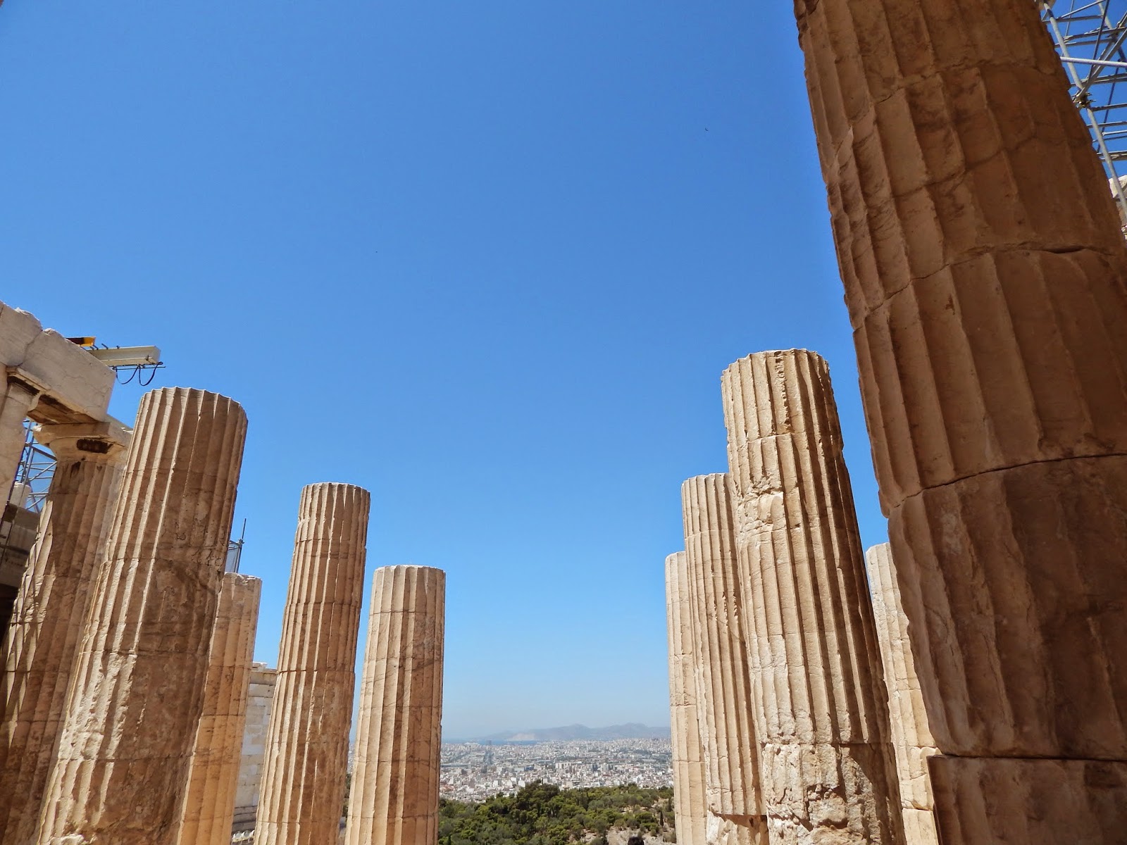 Seuraavana aamuna päätettiin heti aamusta lähteä Akropoliksen kukkulalle. Käveltiin hotellilta metroasemalle ja ostettiin päivän lippu, joka maksaa 4 eur/pv. Päivälippu käy kaikissa julkisen liikenteen kulkuneuvoissa. Olin jo aiemmin lukenut, että Akropoliksella pitää varautua ruuhkaan, jos ei ole ihan aikaisin aamulla liikkeellä. Me oltiin siinä noin klo 11 ja ihmisiä oli jo siihen aikaa todella paljon. Lippujono ei ollut onneksi kovin pitkä eli ostettiin 12 eur lippu/hlö (12 vuotias pääsi ilmaiseksi) ja alettiin kipua ylös kukkulalle. Samalla lipulla pääsi katsastamaan aika monta nähtävyyttä eli lippu kannattaa säilyttää. Ilma oli jo siihen aikaa todella kuuma ja aurinko paistoi pilvettömältä taivaalta. Onneksi kukkulalla tuuli hiukan eli kävely kukkulalla ei tuntunut niin tukalalta. Ennen kun pääsee Parthenonin temppelille, kävellään läpi porttirakennelman eli propylaian. Näkymät kukkulalta Ateenan kaupungille ovat mahtavat.