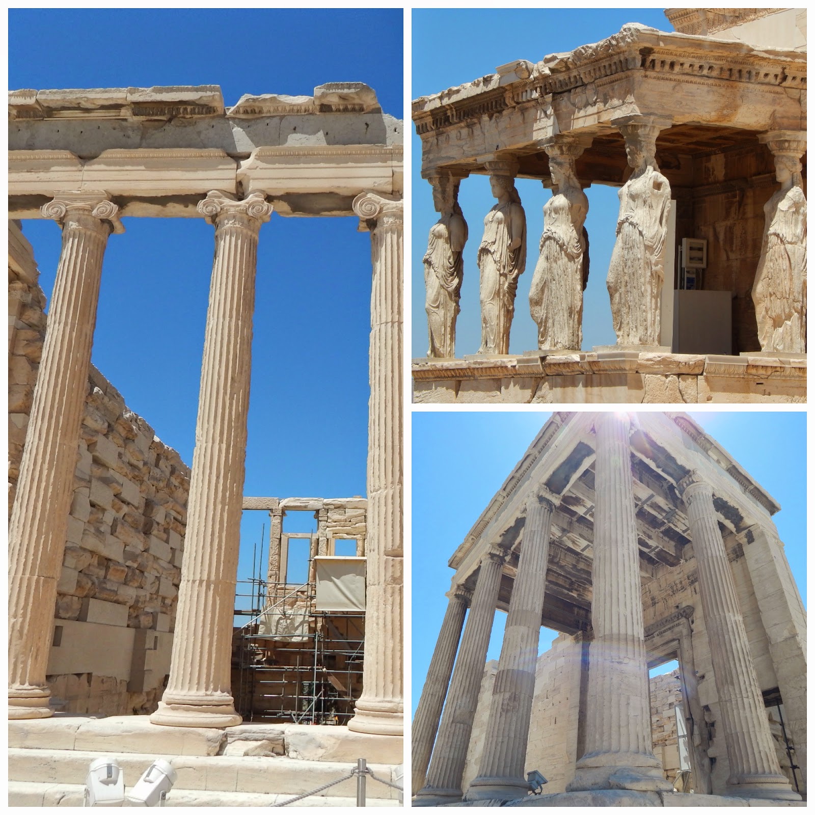 Kierreltiin kaikki Akropoliksen kukkulalla säilyneet antiikinaikaiset palatsit ja muut rakennukset. Parhaiten ovat säilyneet Parthenonin ja Erekhtheionin temppelit sekä Dionysoksen teatteri. Aika monen rakennuksen kohdalla pitää käyttää mielikuvitusta, koska jäljellä ovat vain rauniot.