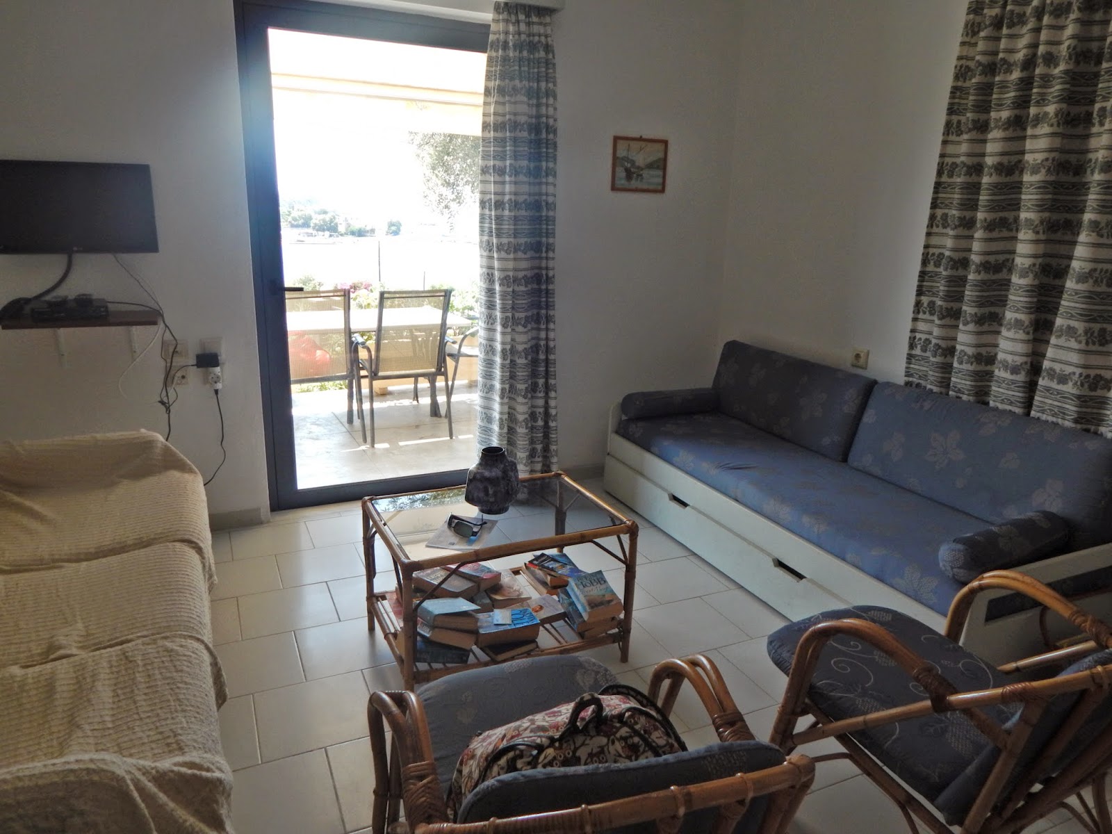 Asunto sijaitsee todella hyvällä paikalla ja terassilta on suora näkymä merelle. Kyseinen asunto on talossa, jossa on 4 asuntoa. Kolme pienempää asuntoa on alakerrassa ja iso villa yläkerrassa. Asuntoihin voi tutustua Terpsichori Villa ja Apartments sivuilla. Asunto on yksinkertaisesti sisustettu, mutta kaikki tarvittava löytyy. Myös keittiövarustus on todella hyvä. Kylppäristä löytyy myös pesukone.