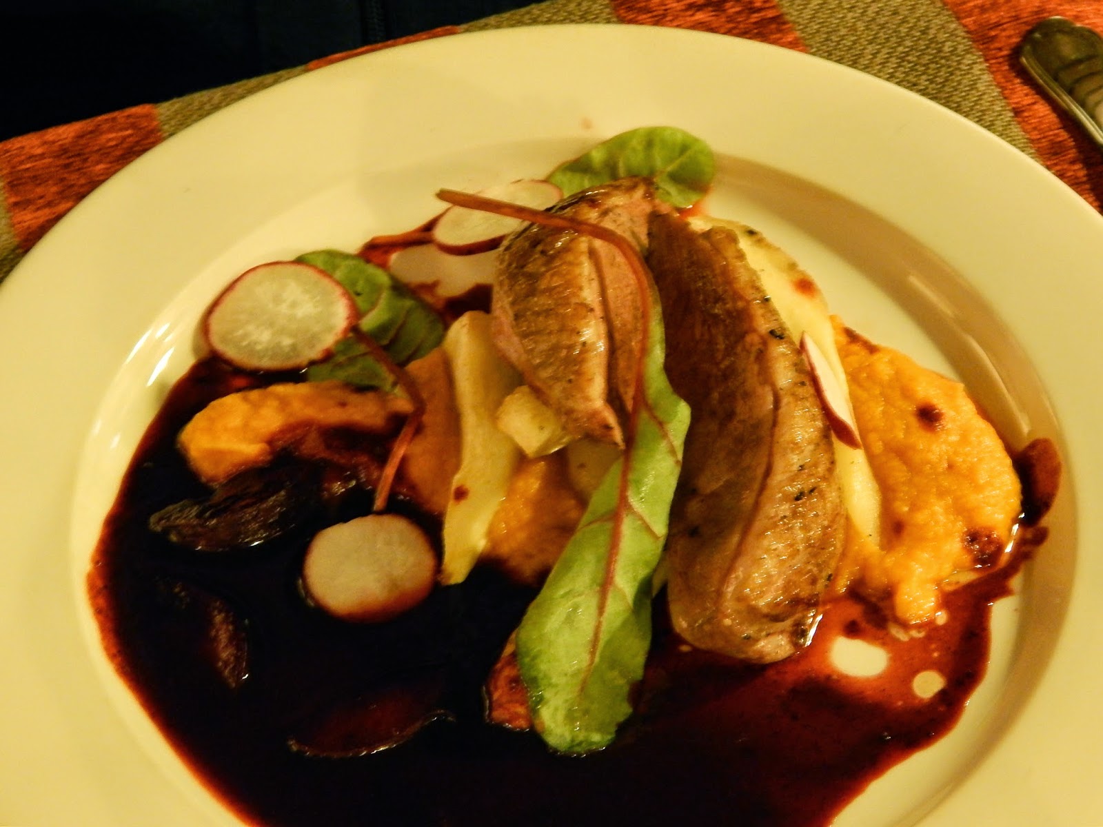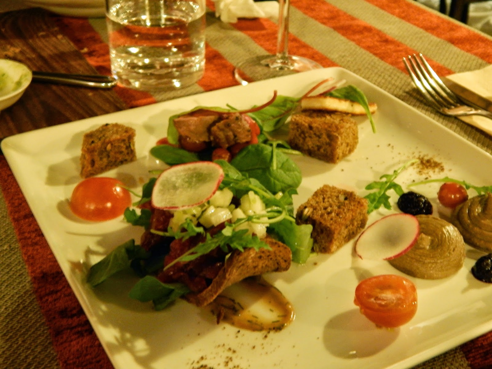 Alkupalaksi otettiin savujuusto tomaattikeittoa ja koottu valikoima parhaita alkupaloja. Pääruuaksi otin härän sisäfileen ja mieheni otti ankkaa.