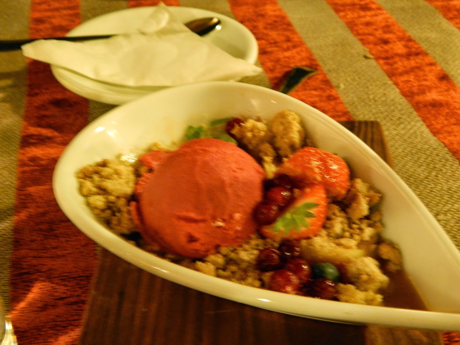 Jälkiruuaksi otettiin lämmintä omenapiirakkaa marjoilla ja vadelmasorbetilla. Tämä jälkiruoka oli meidän makuun hieman liian raikas eli olisi pitänyt ottaa suklaakakku tai juustokakkua. Jälkikäteen luin, että asiakkaat ovat kehuneet kyseisen paikan juustokakkua. Voin suositella kyseistä paikkaa oikein lämpimästi. Pöytävaraus kannattaa tehdä etukäteen, koska paikka on hyvin suosittu.
